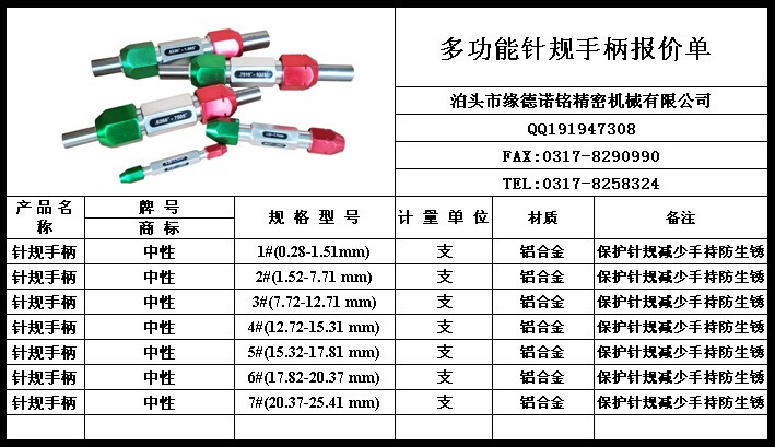 針規(guī)專(zhuān)用手柄材質(zhì)為鋁合金7種型號(hào)供您選擇可跟據(jù)您的尺寸來(lái)選手柄相應(yīng)規(guī)格內(nèi)通用這樣減少了手柄數(shù)量節(jié)約成本。